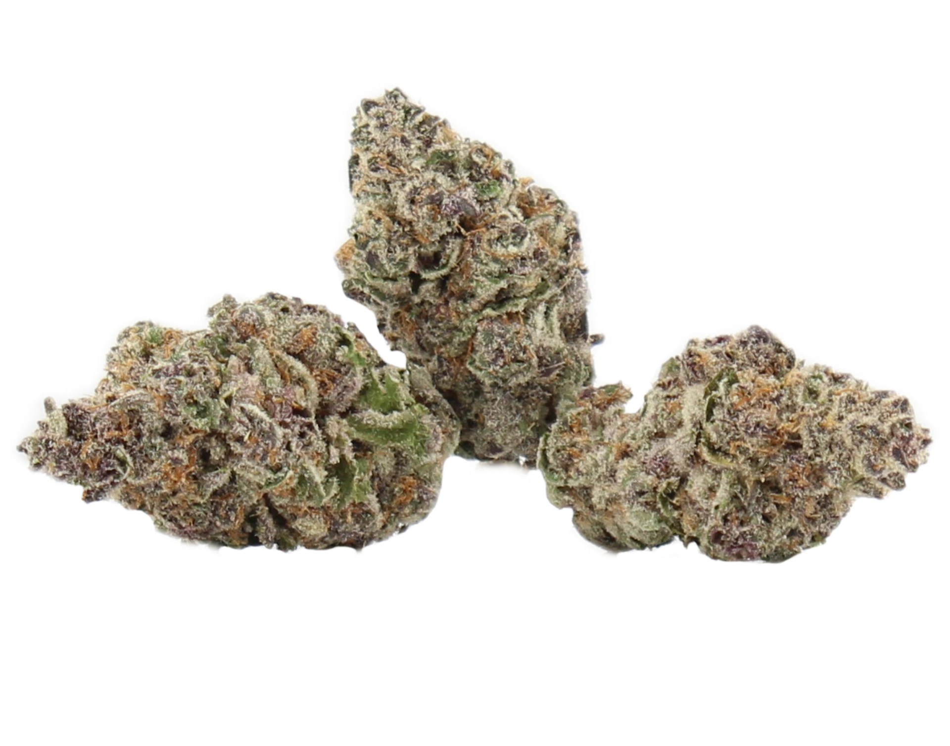 Purple Sunrise is a hybrid strain that stands out with bold color, rich aroma, and beautifully structured buds. Each nug grows dense and heart shaped, showing off deep forest green tones wrapped in thin orange hairs and finished with chunky golden white trichomes that sparkle across the surface. The frosty coating and tight structure give this flower serious bag appeal the moment you see it.